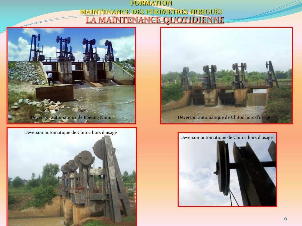 FORMATION MAINTENANCE DES PERIMETRES IRRIGUÈS LA MAINTENANCE QUOTIDIENNE Déversoir automatique de Boeung Nimul Déversoir automatique de Chitoc hors d’usage Déversoir automatique de Chitoc hors d’usage Déversoir automatique de Chitoc hors d’usage