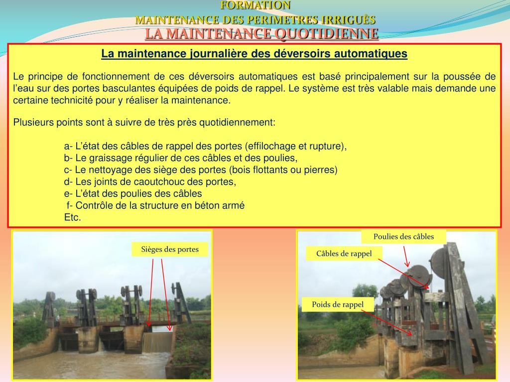 FORMATION MAINTENANCE DES PERIMETRES IRRIGUÈS LA MAINTENANCE QUOTIDIENNE La maintenance journalière des déversoirs automatiques Le principe de fonctionnement de ces déversoirs automatiques est basé principalement sur la poussée de l’eau sur des portes basculantes équipées de poids de rappel. Le système est très valable mais demande une certaine technicité pour y réaliser la maintenance. Plusieurs points sont à suivre de très près quotidiennement: a- L’état des câbles de rappel des portes (effilochage et rupture), b- Le graissage régulier de ces câbles et des poulies, c- Le nettoyage des siège des portes (bois flottants ou pierres) d- Les joints de caoutchouc des portes, e- L’état des poulies des câbles f- Contrôle de la structure en béton armé Etc. Poulies des câbles Sièges des portes Câbles de rappel Poids de rappel