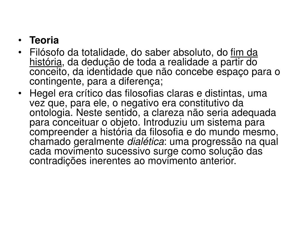Teoria • Filósofo da totalidade, do saber absoluto, do fim da história, da dedução de toda a realidade a partir do conceito, da identidade que não concebe espaço para o contingente, para a diferença; • Hegel era crítico das filosofias claras e distintas, uma vez que, para ele, o negativo era constitutivo da ontologia. Neste sentido, a clareza não seria adequada para conceituar o objeto. Introduziu um sistema para compreender a história da filosofia e do mundo mesmo, chamado geralmente dialética: uma progressão na qual cada movimento sucessivo surge como solução das contradições inerentes ao movimento anterior.