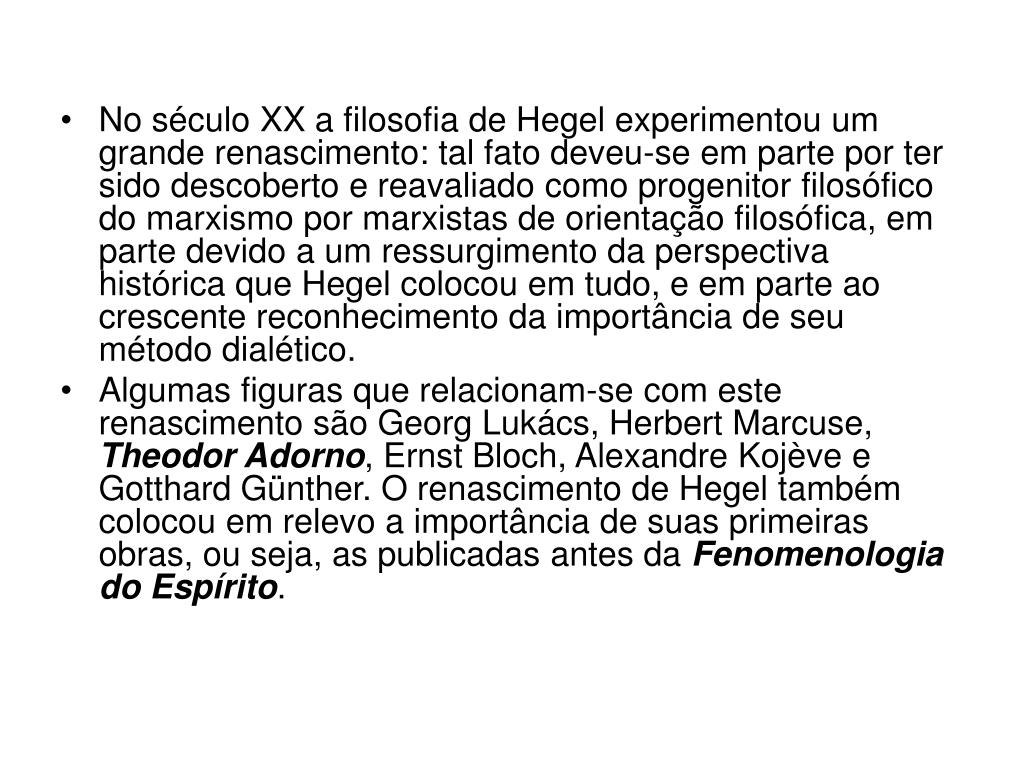 No século XX a filosofia de Hegel experimentou um grande renascimento: tal fato deveu-se em parte por ter sido descoberto e reavaliado como progenitor filosófico do marxismo por marxistas de orientação filosófica, em parte devido a um ressurgimento da perspectiva histórica que Hegel colocou em tudo, e em parte ao crescente reconhecimento da importância de seu método dialético. • Algumas figuras que relacionam-se com este renascimento são Georg Lukács, Herbert Marcuse, Theodor Adorno, Ernst Bloch, Alexandre Kojève e Gotthard Günther. O renascimento de Hegel também colocou em relevo a importância de suas primeiras obras, ou seja, as publicadas antes da Fenomenologia do Espírito.