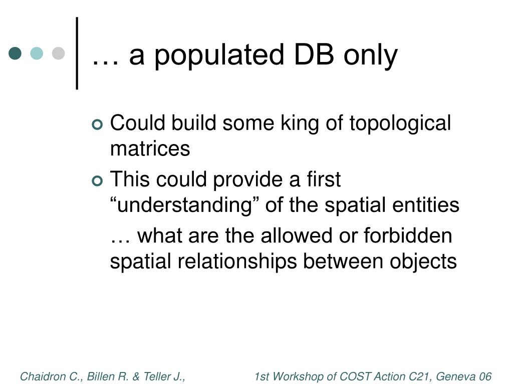 … a populated DB only • Could build some king of topological matrices • This could provide a first “understanding” of the spatial entities … what are the allowed or forbidden spatial relationships between objects Chaidron C., Billen R. & Teller J., 1st Workshop of COST Action C21, Geneva 06