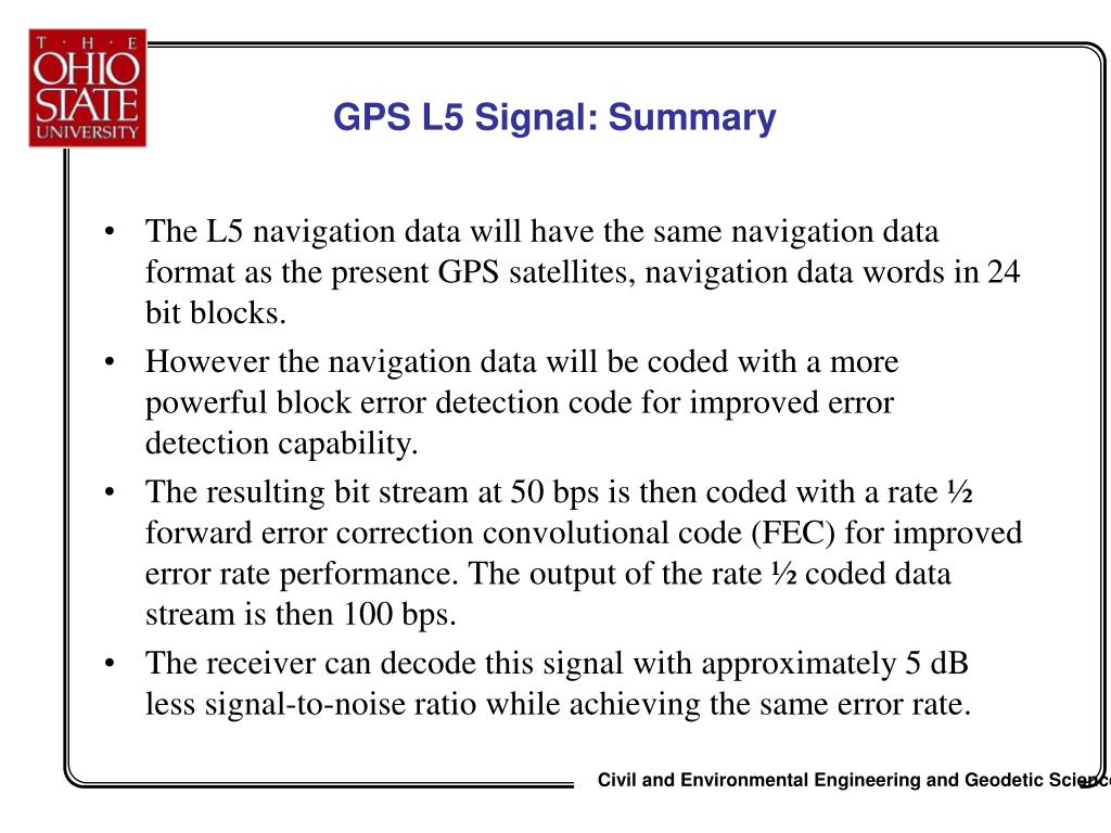 GPS L5 Signal: Summary • The L5 navigation data will have the same navigation data format as the present GPS satellites, navigation data words in 24 bit blocks. • However the navigation data will be coded with a more powerful block error detection code for improved error detection capability. • The resulting bit stream at 50 bps is then coded with a rate ½ forward error correction convolutional code (FEC) for improved error rate performance. The output of the rate ½ coded data stream is then 100 bps. • The receiver can decode this signal with approximately 5 dB less signal-to-noise ratio while achieving the same error rate.