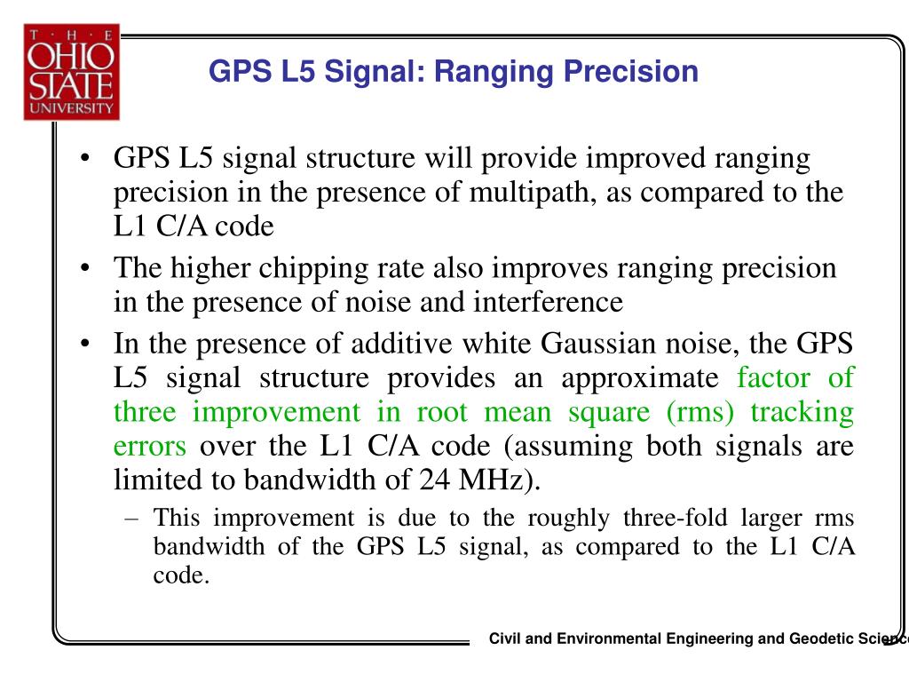 GPS L5 Signal: Ranging Precision • GPS L5 signal structure will provide improved ranging precision in the presence of multipath, as compared to the L1 C/A code • The higher chipping rate also improves ranging precision in the presence of noise and interference • In the presence of additive white Gaussian noise, the GPS L5 signal structure provides an approximate factor of three improvement in root mean square (rms) tracking errors over the L1 C/A code (assuming both signals are limited to bandwidth of 24 MHz). • This improvement is due to the roughly three-fold larger rms bandwidth of the GPS L5 signal, as compared to the L1 C/A code.