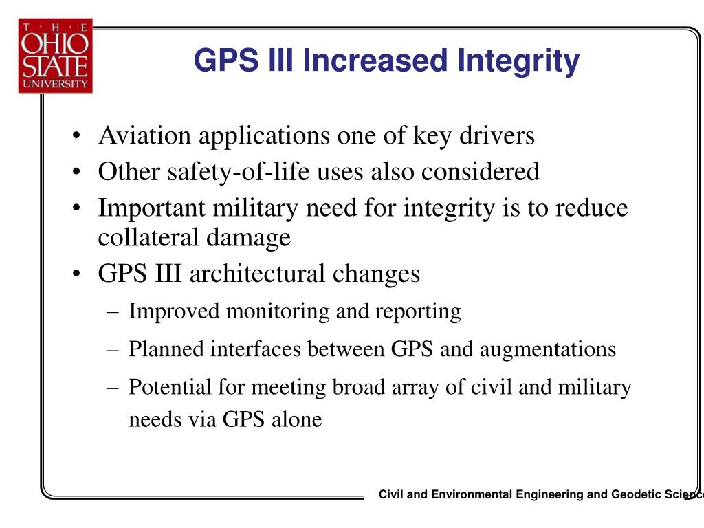 GPS III Increased Capability • Assured Delivery of GPS Signals • Higher Power Military & Civil Signals • Higher Accuracy Service for All Users • Increased Integrity1 Inherent in GPS 1the ability of a system to provide timely detection and warning of the system faults