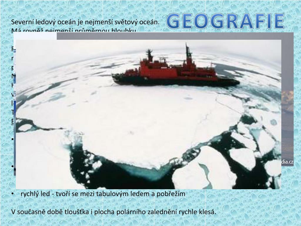 GEOGRAFIE • Severní ledový oceán je nejmenší světový oceán. • Má rovněž nejmenší průměrnou hloubku. • Rozkládá se kolem severního zemského pólu, • má rozlohu asi 14 mil. km², • průměrná hloubka je 1328 m. • Nejhlubší místo 5449 m (Polární hlubokomořská planina). • Hladinu Severního ledového oceánu pokrývá větší část roku silná vrstva ledu, takže se po většině jeho plochy mohou v této době plavit pouze těžké ledoborce (a někde ani ty ne) či lodě plující v jejich stopách. • Tento mořský led vzniká ze zamrzlé mořské vody. • Existují tři druhy polárního ledu: • polární - pokrývá větší část oceánu, jeho tloušťka je až 50 m, v létě taje a tloušťka se zmenšuje až na 2 m • tabulový - vzniká na okrajích oceánu, maximální tloušťka je 2 m. Led je polámaný a ledové kry na sebe narážejí, v období maximálního rozsahu pokrývá asi 12 mil. km² • rychlý led - tvoří se mezi tabulovým ledem a pobřežím • V současně době tloušťka i plocha polárního zalednění rychle klesá.