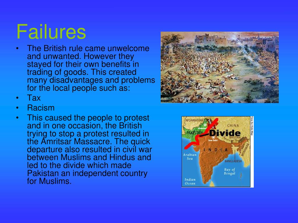 Failures • The British rule came unwelcome and unwanted. However they stayed for their own benefits in trading of goods. This created many disadvantages and problems for the local people such as: • Tax • Racism • This caused the people to protest and in one occasion, the British trying to stop a protest resulted in the Amritsar Massacre. The quick departure also resulted in civil war between Muslims and Hindus and led to the divide which made Pakistan an independent country for Muslims.