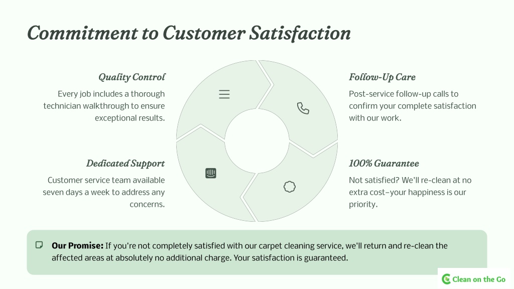Commitment to Customer Satisfaction Quality Control Follow-Up Care Every job includes a thorough technician walkthrough to ensure exceptional results. Post-service follow-up calls to confirm your complete satisfaction with our work. Dedicated Support 100% Guarantee Customer service team available seven days a week to address any concerns. Not satisfied? We'll re-clean at no extra cost—your happiness is our priority. Our Promise: If you're not completely satisfied with our carpet cleaning service, we'll return and re-clean the affected areas at absolutely no additional charge. Your satisfaction is guaranteed.