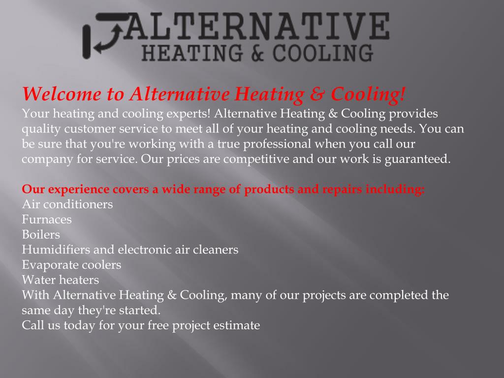 Welcome to Alternative Heating & Cooling! Your heating and cooling experts! Alternative Heating & Cooling provides quality customer service to meet all of your heating and cooling needs. You can be sure that you're working with a true professional when you call our company for service. Our prices are competitive and our work is guaranteed. Our experience covers a wide range of products and repairs including: Air conditioners Furnaces Boilers Humidifiers and electronic air cleaners Evaporate coolers Water heaters With Alternative Heating & Cooling, many of our projects are completed the same day they're started. Call us today for your free project estimate
