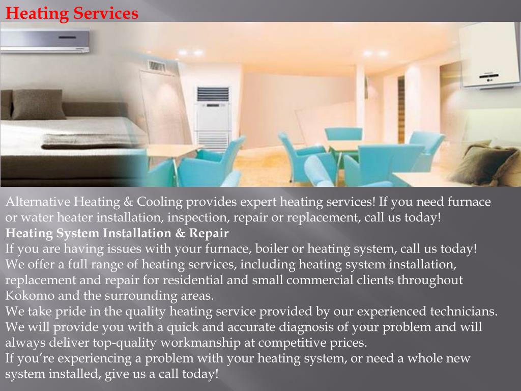 Heating Services Alternative Heating & Cooling provides expert heating services! If you need furnace or water heater installation, inspection, repair or replacement, call us today! Heating System Installation & Repair If you are having issues with your furnace, boiler or heating system, call us today! We offer a full range of heating services, including heating system installation, replacement and repair for residential and small commercial clients throughout Kokomo and the surrounding areas. We take pride in the quality heating service provided by our experienced technicians. We will provide you with a quick and accurate diagnosis of your problem and will always deliver top-quality workmanship at competitive prices. If you’re experiencing a problem with your heating system, or need a whole new system installed, give us a call today!