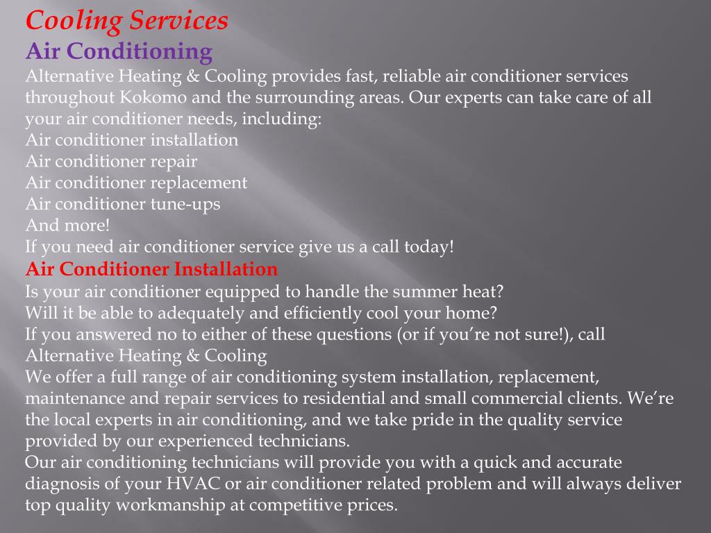 Cooling Services Air Conditioning Alternative Heating & Cooling provides fast, reliable air conditioner services throughout Kokomo and the surrounding areas. Our experts can take care of all your air conditioner needs, including: Air conditioner installation Air conditioner repair Air conditioner replacement Air conditioner tune-ups And more! If you need air conditioner service give us a call today! Air Conditioner Installation Is your air conditioner equipped to handle the summer heat? Will it be able to adequately and efficiently cool your home? If you answered no to either of these questions (or if you’re not sure!), call Alternative Heating & Cooling We offer a full range of air conditioning system installation, replacement, maintenance and repair services to residential and small commercial clients. We’re the local experts in air conditioning, and we take pride in the quality service provided by our experienced technicians. Our air conditioning technicians will provide you with a quick and accurate diagnosis of your HVAC or air conditioner related problem and will always deliver top quality workmanship at competitive prices.