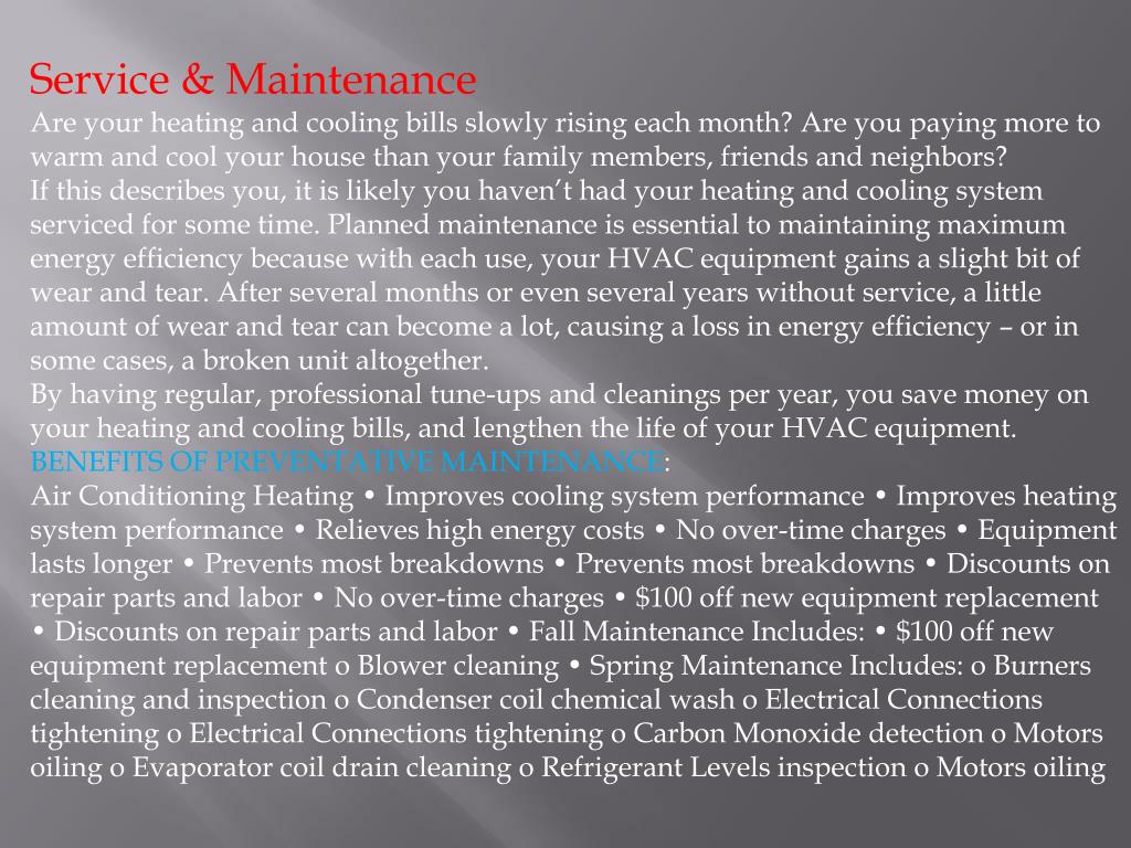 Service & Maintenance Are your heating and cooling bills slowly rising each month? Are you paying more to warm and cool your house than your family members, friends and neighbors? If this describes you, it is likely you haven’t had your heating and cooling system serviced for some time. Planned maintenance is essential to maintaining maximum energy efficiency because with each use, your HVAC equipment gains a slight bit of wear and tear. After several months or even several years without service, a little amount of wear and tear can become a lot, causing a loss in energy efficiency – or in some cases, a broken unit altogether. By having regular, professional tune-ups and cleanings per year, you save money on your heating and cooling bills, and lengthen the life of your HVAC equipment. BENEFITS OF PREVENTATIVE MAINTENANCE: Air Conditioning Heating • Improves cooling system performance • Improves heating system performance • Relieves high energy costs • No over-time charges • Equipment lasts longer • Prevents most breakdowns • Prevents most breakdowns • Discounts on repair parts and labor • No over-time charges • $100 off new equipment replacement • Discounts on repair parts and labor • Fall Maintenance Includes: • $100 off new equipment replacement o Blower cleaning • Spring Maintenance Includes: o Burners cleaning and inspection o Condenser coil chemical wash o Electrical Connections tightening o Electrical Connections tightening o Carbon Monoxide detection o Motors oiling o Evaporator coil drain cleaning o Refrigerant Levels inspection o Motors oiling
