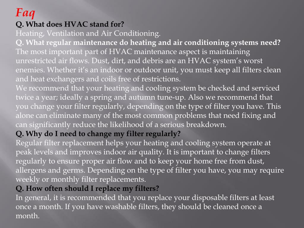 Faq Q. What does HVAC stand for? Heating, Ventilation and Air Conditioning. Q. What regular maintenance do heating and air conditioning systems need? The most important part of HVAC maintenance aspect is maintaining unrestricted air flows. Dust, dirt, and debris are an HVAC system’s worst enemies. Whether it’s an indoor or outdoor unit, you must keep all filters clean and heat exchangers and coils free of restrictions. We recommend that your heating and cooling system be checked and serviced twice a year; ideally a spring and autumn tune-up. Also we recommend that you change your filter regularly, depending on the type of filter you have. This alone can eliminate many of the most common problems that need fixing and can significantly reduce the likelihood of a serious breakdown. Q. Why do I need to change my filter regularly? Regular filter replacement helps your heating and cooling system operate at peak levels and improves indoor air quality. It is important to change filters regularly to ensure proper air flow and to keep your home free from dust, allergens and germs. Depending on the type of filter you have, you may require weekly or monthly filter replacements. Q. How often should I replace my filters? In general, it is recommended that you replace your disposable filters at least once a month. If you have washable filters, they should be cleaned once a month.