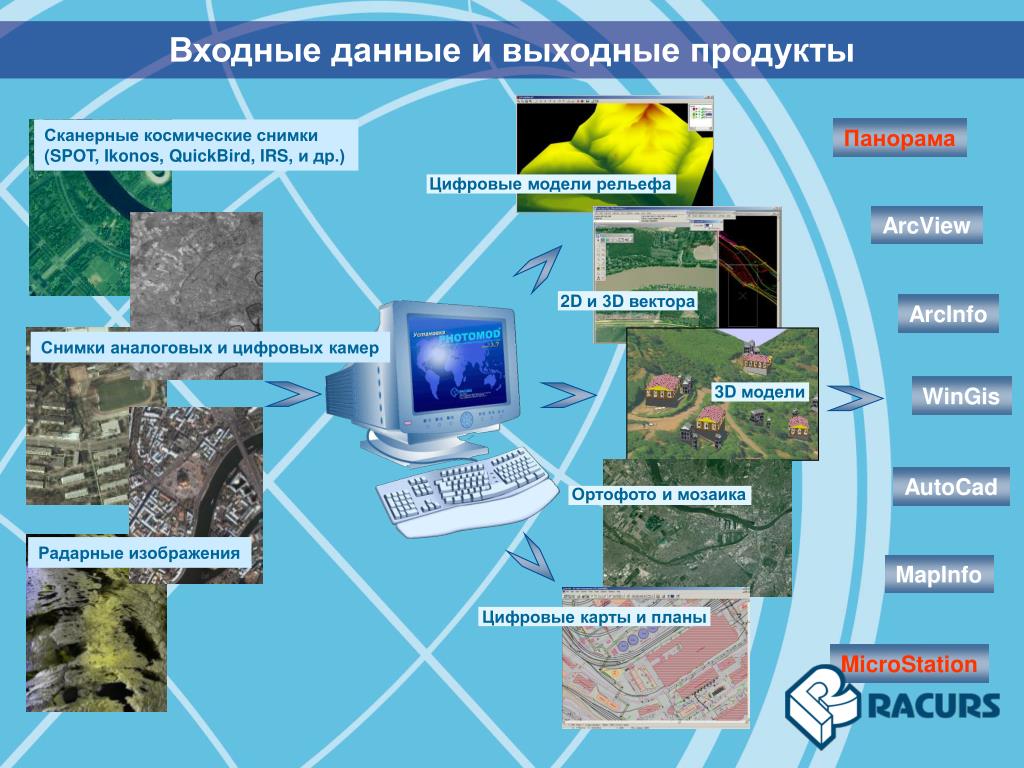 Цифровые модели рельефа 2D и 3D вектора 3D модели Ортофото и мозаика Радарные изображения Цифровые карты и планы Входные данные и выходные продукты Панорама Сканерные космические снимки (SPOT, Ikonos, QuickBird, IRS, и др.) ArcView ArcInfo Снимки аналоговых и цифровых камер WinGis AutoCad MapInfo MicroStation
