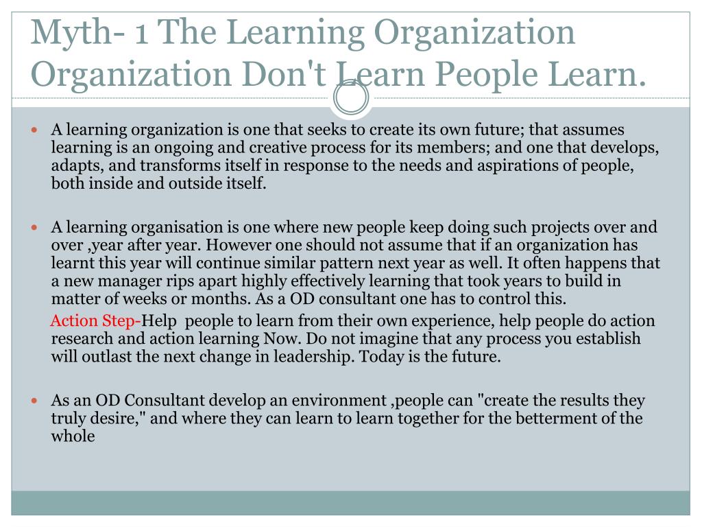 Myth- 1 The Learning OrganizationOrganization Don't Learn People Learn. • A learning organization is one that seeks to create its own future; that assumes learning is an ongoing and creative process for its members; and one that develops, adapts, and transforms itself in response to the needs and aspirations of people, both inside and outside itself. • A learning organisation is one where new people keep doing such projects over and over ,year after year. However one should not assume that if an organization has learnt this year will continue similar pattern next year as well. It often happens that a new manager rips apart highly effectively learning that took years to build in matter of weeks or months. As a OD consultant one has to control this. Action Step-Help people to learn from their own experience, help people do action research and action learning Now. Do not imagine that any process you establish will outlast the next change in leadership. Today is the future. • As an OD Consultant develop an environment ,people can "create the results they truly desire," and where they can learn to learn together for the betterment of the whole