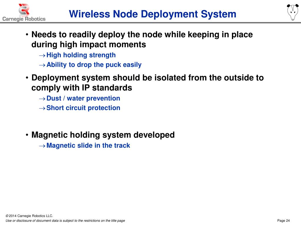 Wireless Node Deployment System • Needs to readily deploy the node while keeping in place during high impact moments • High holding strength • Ability to drop the puck easily • Deployment system should be isolated from the outside to comply with IP standards • Dust / water prevention • Short circuit protection • Magnetic holding system developed • Magnetic slide in the track