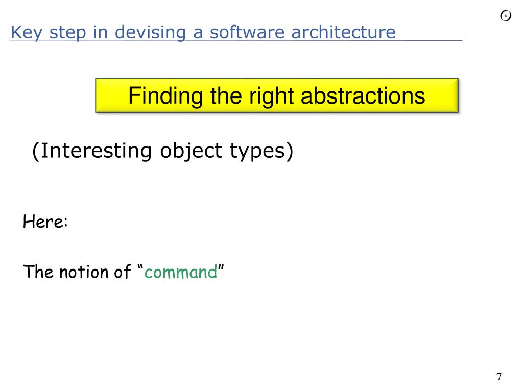 Key step in devising a software architecture Here: The notion of “command” Finding the right abstractions (Interesting object types)