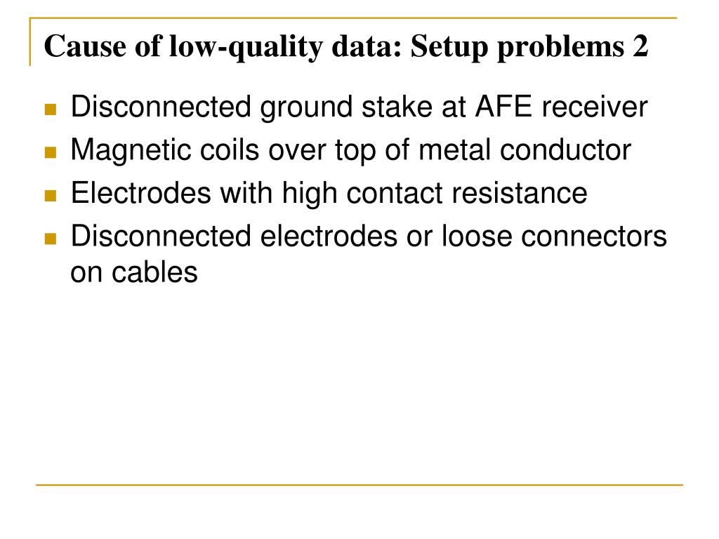 Cause of low-quality data: Setup problems 2 • Disconnected ground stake at AFE receiver • Magnetic coils over top of metal conductor • Electrodes with high contact resistance • Disconnected electrodes or loose connectors on cables