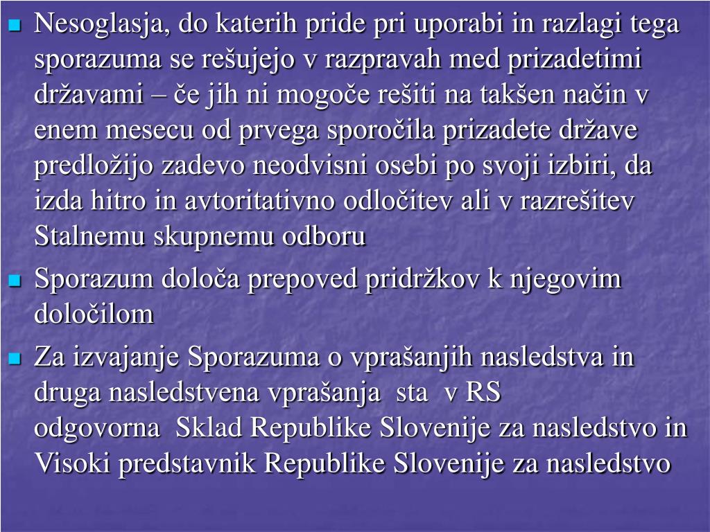 Nesoglasja, do katerih pride pri uporabi in razlagi tega sporazuma se rešujejo v razpravah med prizadetimi državami – če jih ni mogoče rešiti na takšen način v enem mesecu od prvega sporočila prizadete države predložijo zadevo neodvisni osebi po svoji izbiri, da izda hitro in avtoritativno odločitev ali v razrešitev Stalnemu skupnemu odboru • Sporazum določa prepoved pridržkov k njegovim določilom • Za izvajanje Sporazuma o vprašanjih nasledstva in druga nasledstvena vprašanja sta v RS odgovorna Sklad Republike Slovenije za nasledstvo in Visoki predstavnik Republike Slovenije za nasledstvo