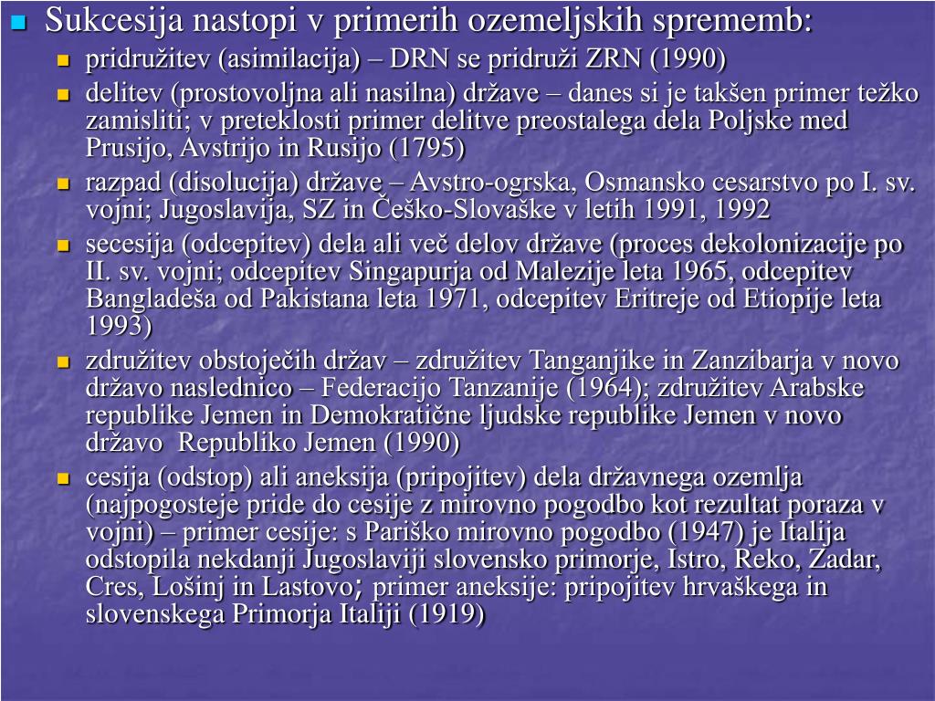Javni dolgovi Načeloma velja pravilo res transit cum onere suo: država-dedič prevzema skupaj z ozemljem tudi javne dolgove “Lokalizirani”, “teritorialno locirani” dolgovi: država-naslednica jih prevzame s trenutkom odcepitve Splošni “nelocirani” dolg države predhodnice (npr. tisti, ki nastane zaradi vzdrževanja monetarne stabilnosti ali zaradi skupnih stroškov) se razdeli med države naslednice po ključu, ki bi moral veljati za razdelitev državnega premoženja države predhodnice Prenehanje obstoja enega subjekta MP in prenos celotnega ozemlja na drugega – dolg se prenese v celoti (npr. SHS – Srbija in Črna Gora) Razpad ali delitev države na več držav: države-dediči odgovarjajo za dolgove solidarno – delitev deležev dolgov po različnih kriterijih (ekonomska moč, velikost ozemlja, število prebivalstva) Če je obstajala prejšnja fiskalna avtonomija ozemlja – država-sukcesor ne prevzame dolga Odcepitev dela državnega ozemlja (država ostane subjekt MP) – država-prednik odgovarja za dolgove, razen če je dolg neposredno vezan na odcepljeno ozemlje Vojni dolgovi – ne glede na to, ali so nastali pred vojno ali tekom vojne, jih država-dedič ni zavezana prevzeti