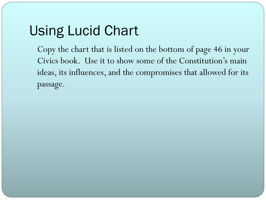 Using Lucid Chart Copy the chart that is listed on the bottom of page 46 in your Civics book. Use it to show some of the Constitution’s main ideas, its influences, and the compromises that allowed for its passage.
