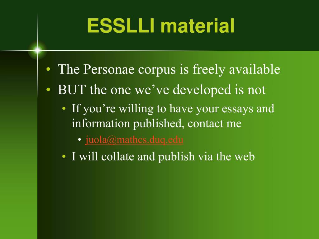 ESSLLI material • The Personae corpus is freely available • BUT the one we’ve developed is not • If you’re willing to have your essays and information published, contact me • juola@mathcs.duq.edu • I will collate and publish via the web