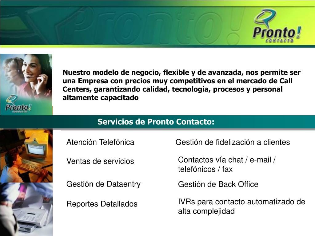 Nuestro modelo de negocio, flexible y de avanzada, nos permite ser una Empresa con precios muy competitivos en el mercado de Call Centers, garantizando calidad, tecnología, procesos y personal altamente capacitado Servicios de Pronto Contacto: Atención Telefónica Gestión de fidelización a clientes Contactos vía chat / e-mail / telefónicos / fax Ventas de servicios Gestión de Dataentry Gestión de Back Office IVRs para contacto automatizado de alta complejidad Reportes Detallados