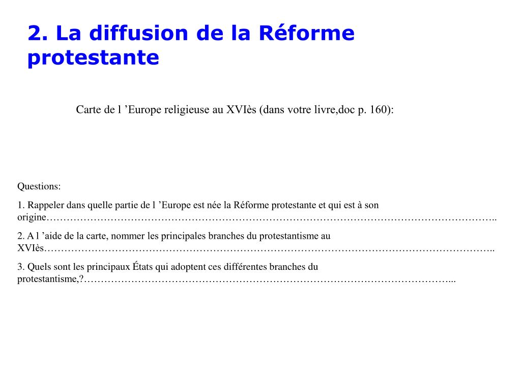 2. La diffusion de la Réforme protestante Carte de l ’Europe religieuse au XVIès (dans votre livre,doc p. 160): Questions: 1. Rappeler dans quelle partie de l ’Europe est née la Réforme protestante et qui est à son origine…………………………………………………………………………………………………………………….. 2. A l ’aide de la carte, nommer les principales branches du protestantisme au XVIès…………………………………………………………………………………………………………………….. 3. Quels sont les principaux États qui adoptent ces différentes branches du protestantisme,?………………………………………………………………………………………………...