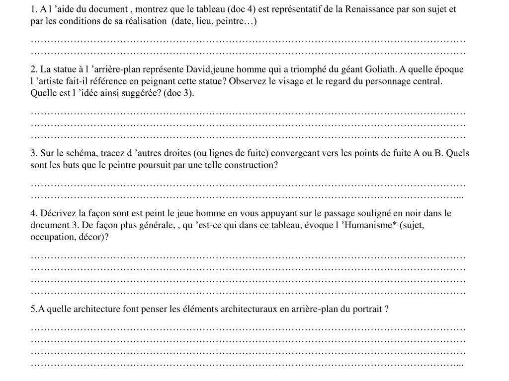 1. A l ’aide du document , montrez que le tableau (doc 4) est représentatif de la Renaissance par son sujet et par les conditions de sa réalisation (date, lieu, peintre…) ………………………………………………………………………………………………………………………………………………………………………………………………………………………………………… 2. La statue à l ’arrière-plan représente David,jeune homme qui a triomphé du géant Goliath. A quelle époque l ’artiste fait-il référence en peignant cette statue? Observez le visage et le regard du personnage central. Quelle est l ’idée ainsi suggérée? (doc 3). ……………………………………………………………………………………………………………………………………………………………………………………………………………………………………………………………………………………………………………………………………………………………… 3. Sur le schéma, tracez d ’autres droites (ou lignes de fuite) convergeant vers les points de fuite A ou B. Quels sont les buts que le peintre poursuit par une telle construction? ………………………………………………………………………………………………………………………………………………………………………………………………………………………………………... 4. Décrivez la façon sont est peint le jeue homme en vous appuyant sur le passage souligné en noir dans le document 3. De façon plus générale, , qu ’est-ce qui dans ce tableau, évoque l ’Humanisme* (sujet, occupation, décor)? …………………………………………………………………………………………………………………………………………………………………………………………………………………………………………………………………………………………………………………………………………………………………………………………………………………………………………………………………………………… 5.A quelle architecture font penser les éléments architecturaux en arrière-plan du portrait ? …………………………………………………………………………………………………………………………………………………………………………………………………………………………………………………………………………………………………………………………………………………………………………………………………………………………………………………………………………………...