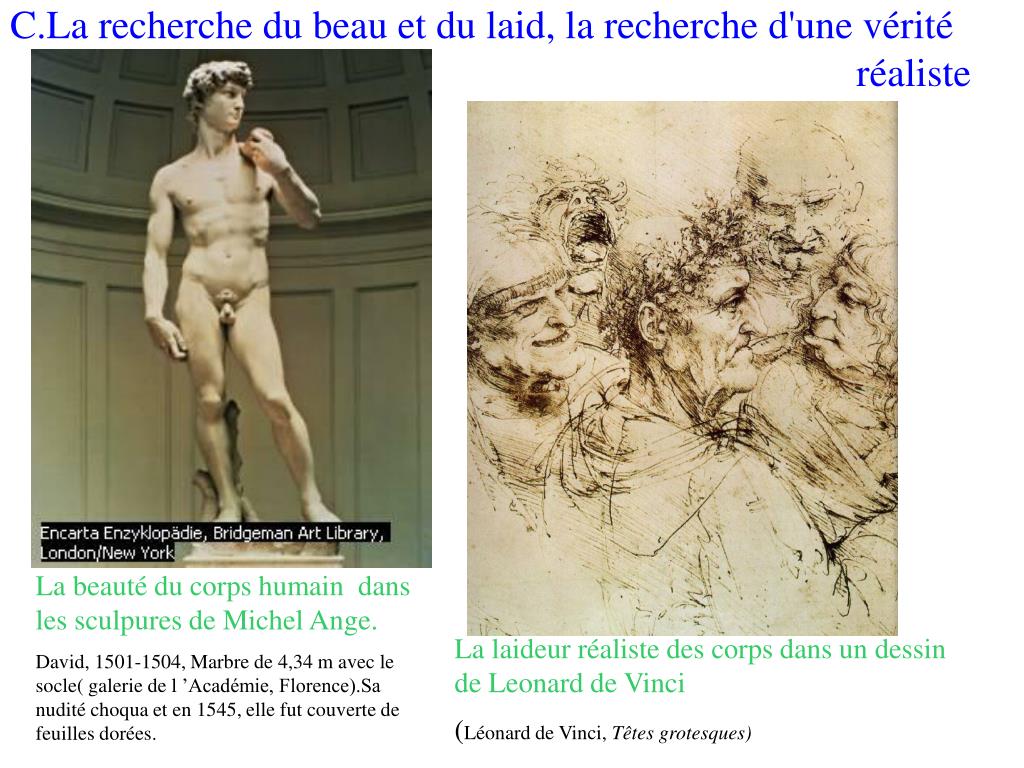 C.La recherche du beau et du laid, la recherche d'une vérité réaliste Sa nudité choqua et en 1545, elle fut couverte de feuilles dorées. La beauté du corps humain dans les sculpures de Michel Ange. David, 1501-1504, Marbre de 4,34 m avec le socle( galerie de l ’Académie, Florence).Sa nudité choqua et en 1545, elle fut couverte de feuilles dorées. La laideur réaliste des corps dans un dessin de Leonard de Vinci (Léonard de Vinci, Têtes grotesques)