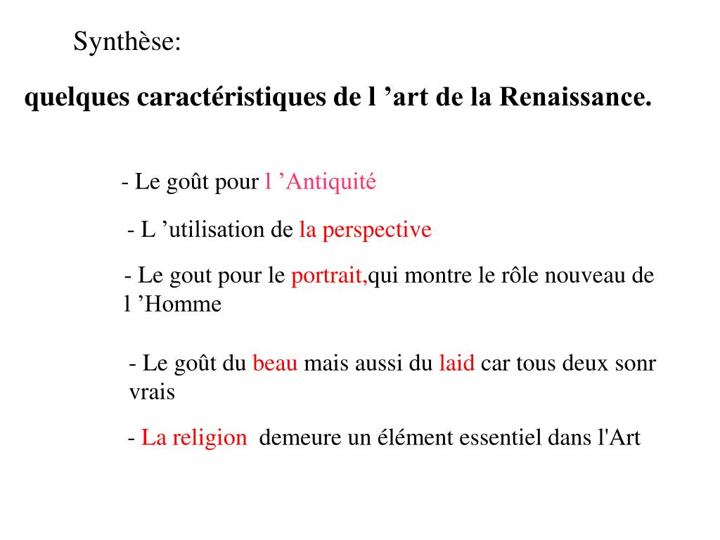 Synthèse: quelques caractéristiques de l ’art de la Renaissance. - Le goût pour l ’Antiquité - L ’utilisation dela perspective - Le gout pour le portrait,quimontre le rôle nouveau de l ’Homme - Le goût du beau mais aussi du laid car tous deux sonr vrais - La religion demeure un élément essentiel dans l'Art