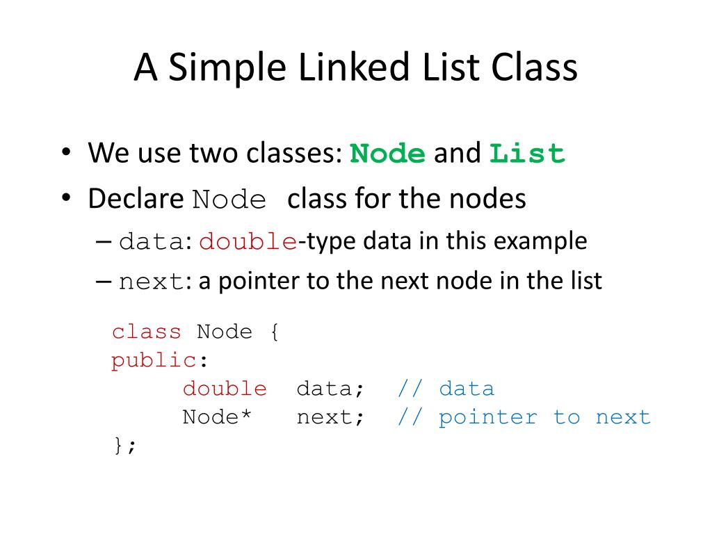A Simple Linked List Class • We use two classes: Node and List • Declare Node class for the nodes • data: double-type data in this example • next: a pointer to the next node in the list class Node { public: doubledata; // data Node* next; // pointer to next };