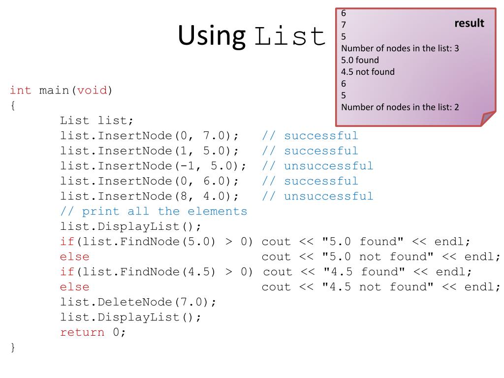 6 7 5 Number of nodes in the list: 3 5.0 found 4.5 not found 6 5 Number of nodes in the list: 2 result Using List int main(void) { List list; list.InsertNode(0, 7.0); // successful list.InsertNode(1, 5.0); // successful list.InsertNode(-1, 5.0); // unsuccessful list.InsertNode(0, 6.0); // successful list.InsertNode(8, 4.0); // unsuccessful // print all the elements list.DisplayList(); if(list.FindNode(5.0) > 0) cout << "5.0 found" << endl; elsecout << "5.0 not found" << endl; if(list.FindNode(4.5) > 0) cout << "4.5 found" << endl; elsecout << "4.5 not found" << endl; list.DeleteNode(7.0); list.DisplayList(); return 0; }