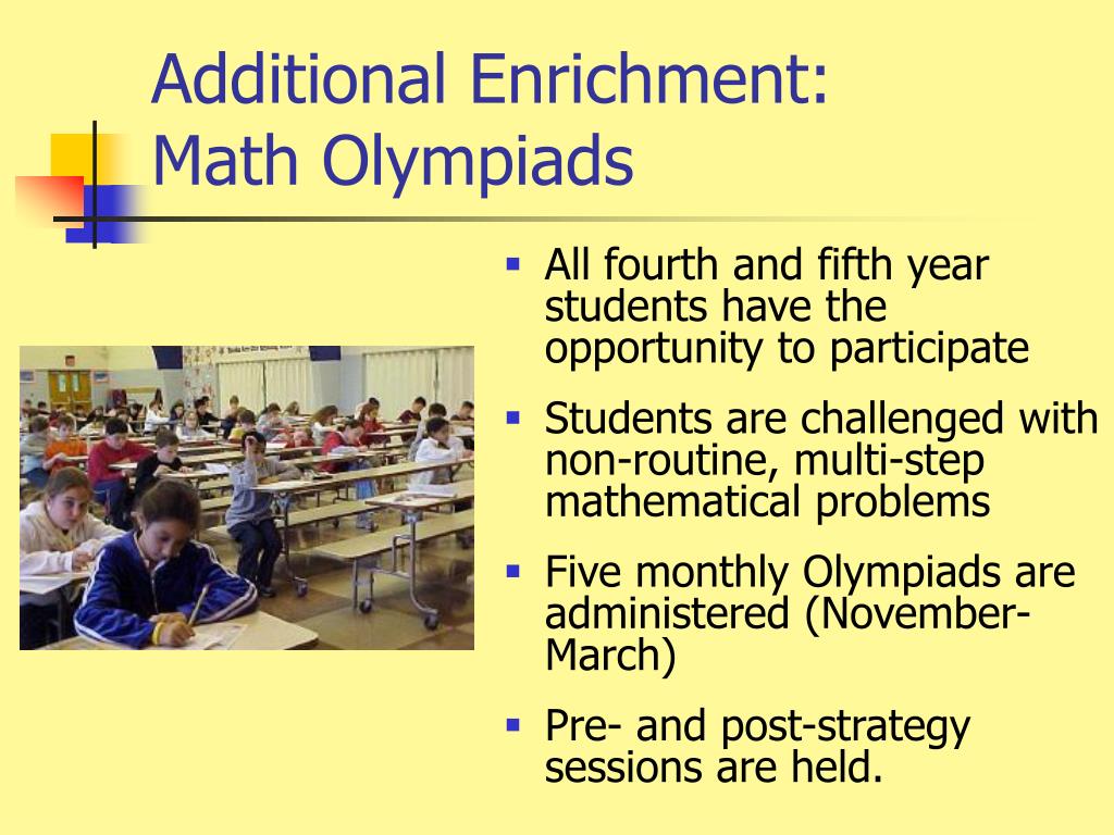 Additional Enrichment: Math Olympiads • All fourth and fifth year students have the opportunity to participate • Students are challenged with non-routine, multi-step mathematical problems • Five monthly Olympiads are administered (November-March) • Pre- and post-strategy sessions are held.