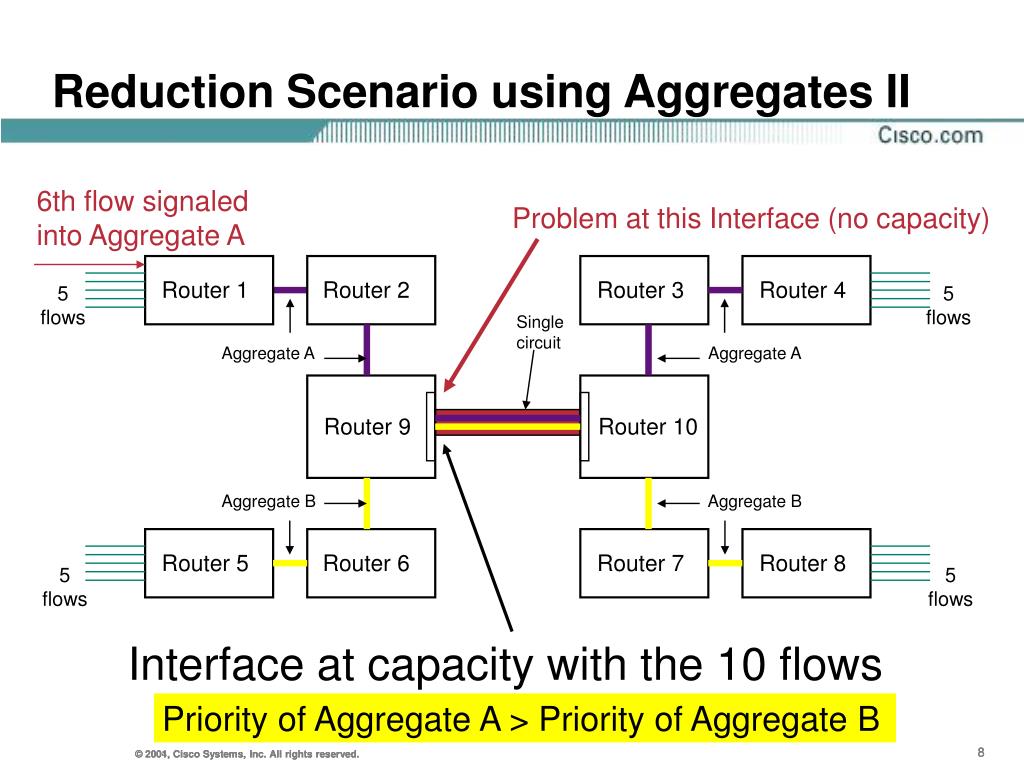 5 flows 5 flows 5 flows 5 flows Interface at capacity with the 10 flows Reduction Scenario using Aggregates I Router 1 Router 2 Router 3 Router 4 Single circuit Aggregate A Aggregate A Router 9 Router 10 Aggregate B Aggregate B Router 5 Router 6 Router 7 Router 8 Priority of Aggregate A > Priority of Aggregate B