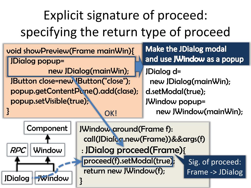 Explicit signature of proceed:specifying the return type of proceed Make the JDialog modaland use JWindowas a popup void showPreview(Frame mainWin){ JDialog popup= new JDialog(mainWin); JButton close=new JButton("close"); popup.getContentPane().add(clase); popup.setVisible(true); } JDialog d= new JDialog(mainWin);d.setModal(true); JWindow popup= new JWindow(mainWin); OK! Component JWindow around(Frame f): call(JDialog.new(Frame))&&args(f) : JDialog proceed(Frame){ proceed(f).setModal(true); return new JWindow(f);} RPC Window Sig. of proceed:Frame -> JDialog JDialog JWindow