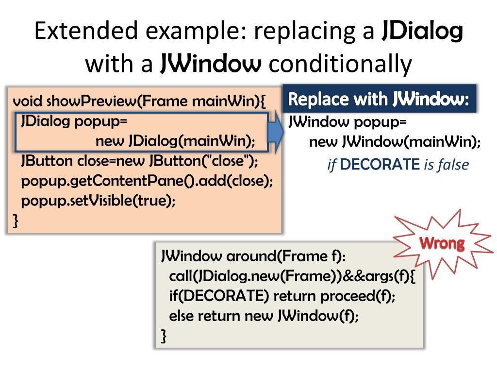 Extended example: replacing a JDialog with a JWindow conditionally Replace with JWindow: void showPreview(Frame mainWin){ JDialog popup= new JDialog(mainWin); JButton close=new JButton("close"); popup.getContentPane().add(close); popup.setVisible(true); } JWindow popup= new JWindow(mainWin); if DECORATEis false Wrong JWindow around(Frame f): call(JDialog.new(Frame))&&args(f){ if(DECORATE) return proceed(f); else return new JWindow(f); }