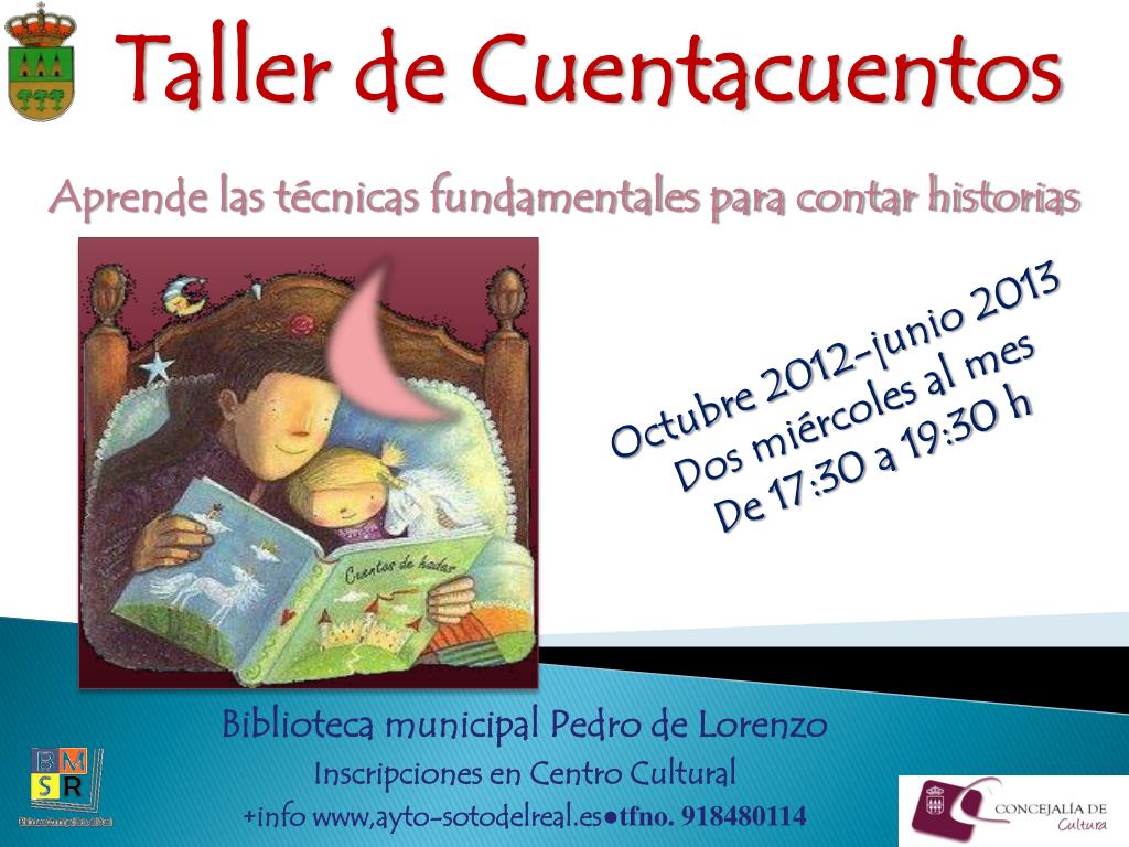 Taller de Cuentacuentos. Aprende las técnicas fundamentales para contar historias. Octubre 2012-junio 2013 Dos miércoles al mes De 17:30 a 19:30 h. Biblioteca municipal Pedro de Lorenzo Inscripciones en Centro Cultural + info www,ayto-sotodelreal.es ●tfno . 918480114.