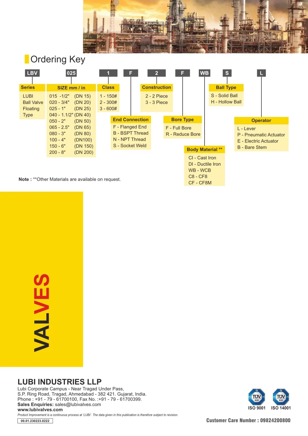 Ordering Key 025 F F WB S L 1 2 LBV Series Class Construction Ball Type S - Solid Ball H - Hollow Ball SIZE mm / in 015 -1/2" 020 - 3/4" 025 - 1" 040 - 1.1/2" 050 - 2" 065 - 2.5" 080 - 3" 100 - 4" 150 - 6" 200 - 8" 1 - 150# 2 - 300# 3 - 600# (DN 15) (DN 20) (DN 25) (DN 40) (DN 50) (DN 65) (DN 80) (DN100) (DN 150) (DN 200) LUBI Ball Valve Floating Type 2 - 2 Piece 3 - 3 Piece Bore Type F - Full Bore R - Reduce Bore End Connection F - Flanged End B - BSPT Thread N - NPT Thread S - Socket Weld Operator L - Lever P - Pneumatic Actuator E - Electric Actuator B - Bare Stem Body Material ** CI - Cast Iron DI - Ductile Iron WB - WCB C8 - CF8 CF - CF8M Note : **Other Materials are available on request. VALVES LUBI INDUSTRIES LLP Lubi Corporate Campus - Near Tragad Under Pass, S.P. Ring Road, Tragad, Ahmedabad - 382 421. Gujarat, India. Phone : +91 - 79 - 61700100, Fax No. :+91 - 79 - 61700399. Sales Enquiries: sales@lubivalves.com www.lubivalves.com Product Improvement is a continuous process at ‘LUBI’. The data given in this publication is therefore subject to revision. 00.01.230223.0222 Customer Care Number : 09824200800