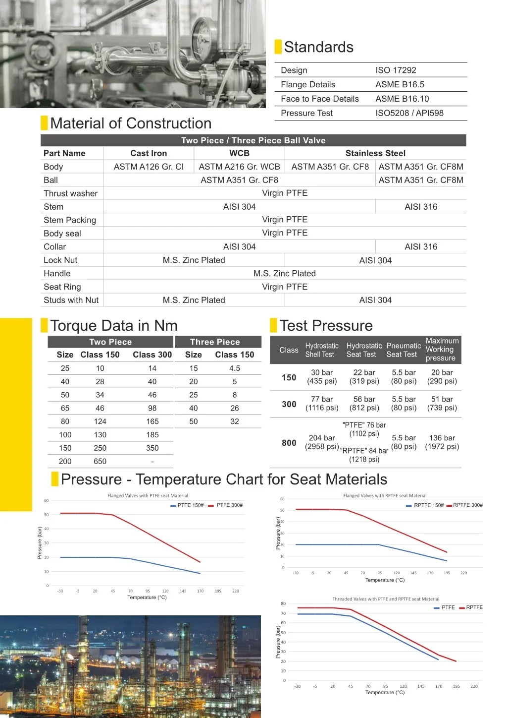Standards Design Flange Details Face to Face Details Pressure Test ISO 17292 ASME B16.5 ASME B16.10 ISO5208 / API598 Material of Construction Two Piece / Three Piece Ball Valve WCB ASTM A216 Gr. WCB ASTM A351 Gr. CF8 AISI 304 AISI 304 M.S. Zinc Plated Part Name Body Ball Thrust washer Stem Stem Packing Body seal Collar Lock Nut Handle Seat Ring Studs with Nut Cast Iron ASTM A126 Gr. CI Stainless Steel ASTM A351 Gr. CF8 ASTM A351 Gr. CF8M ASTM A351 Gr. CF8M AISI 316 AISI 316 AISI 304 Virgin PTFE Virgin PTFE Virgin PTFE M.S. Zinc Plated Virgin PTFE M.S. Zinc Plated AISI 304 Torque Data in Nm Two Piece Test Pressure Maximum Working pressure Three Piece Size 15 20 25 40 50 Hydrostatic Shell Test Hydrostatic Seat Test Pneumatic Seat Test Class Size Class 150 25 40 50 65 80 100 150 200 Pressure - Temperature Chart for Seat Materials Class 300 14 40 46 98 165 185 350 - Class 150 4.5 5 8 26 32 10 28 34 46 124 130 250 650 5.5 bar (80 psi) 30 bar (435 psi) 22 bar (319 psi) 20 bar (290 psi) 150 77 bar (1116 psi) 5.5 bar (80 psi) 56 bar (812 psi) 51 bar (739 psi) 300 "PTFE" 76 bar (1102 psi) 5.5 bar (80 psi) 204 bar (2958 psi) 136 bar (1972 psi) 800 "RPTFE" 84 bar (1218 psi) Flanged Valves with PTFE seat Material Flanged Valves with RPTFE seat Material 60 60 PTFE 300# RPTFE 300# PTFE 150# RPTFE 150# 50 50 Pressure (bar) 40 40 Pressure (bar) 30 30 20 10 20 0 10 -30 -5 20 45 70 95 120 145 170 195 220 Temperature (°C) 0 -30 -5 20 45 70 Temperature (°C) 95 120 145 170 195 220 Threaded Valves with PTFE and RPTFE seat Material 80 RPTFE PTFE 70 60 Pressure (bar) 50 40 30 20 10 0 -30 -5 20 45 70 Temperature (°C) 95 120 145 170 195 220
