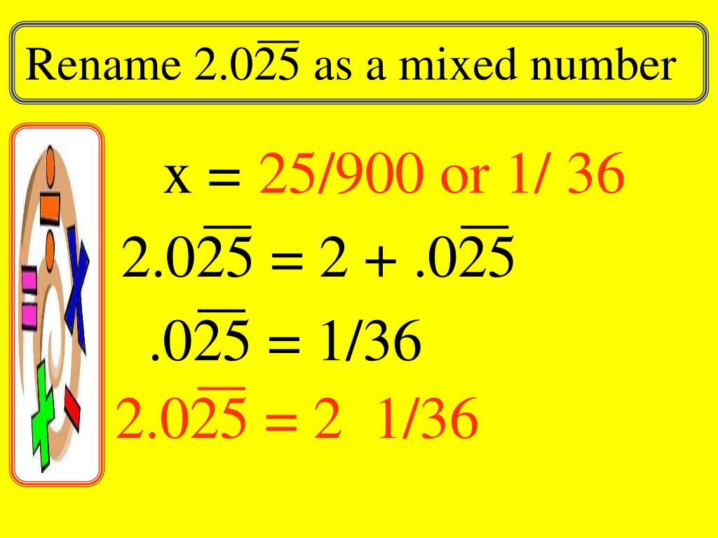 Rename 2.025 as a mixed number 25.25 1000x = 10x = .25 = 990x 25 x = 25/900 or 1/ 36
