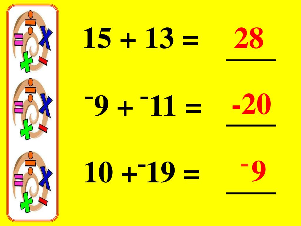 15 + 13 = 28 -20 9 + 11 = 9 10 + 19 =