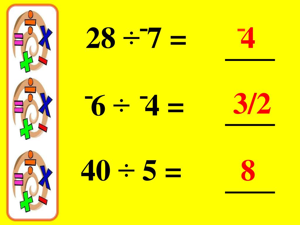28 ÷ 7 = 4 3/2 6 ÷ 4 = 40 ÷ 5 = 8