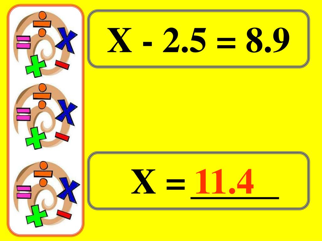 6 – 13 =. -7. -8 – 14 =. -22. 9. -10 +19 =. 15 + 13 =. 28. -20. 9 + 11 =. 9. 10 + 19 =. 5 x 8 =. 40. 24. 6 x 4 =. 190. 10 x 19 =. 9 ÷ 3 =. 3. 9. 18 ÷ 2 =. 6. 54 x 9 =. 28 ÷ 7 =. 4. 3/2. 6 ÷ 4 =. 40 ÷ 5 =. 8. X - 2.5 = 8.9. X =. 11.4.