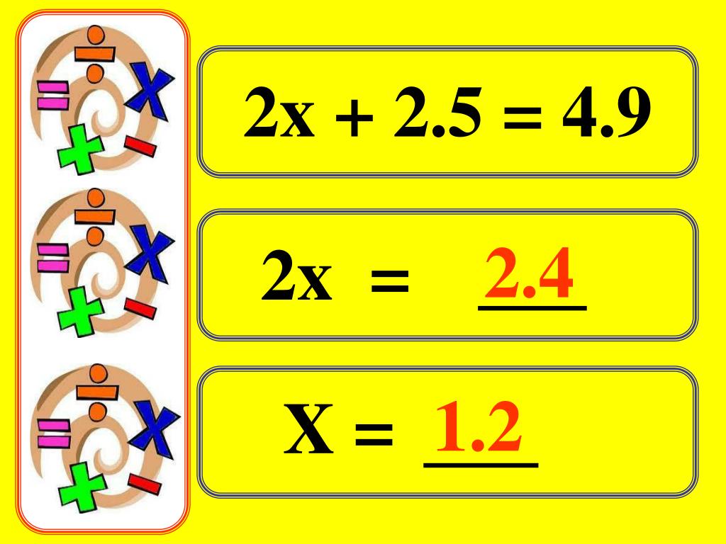 2x + 2.5 = 4.9 2.4 2x = 1.2 X =