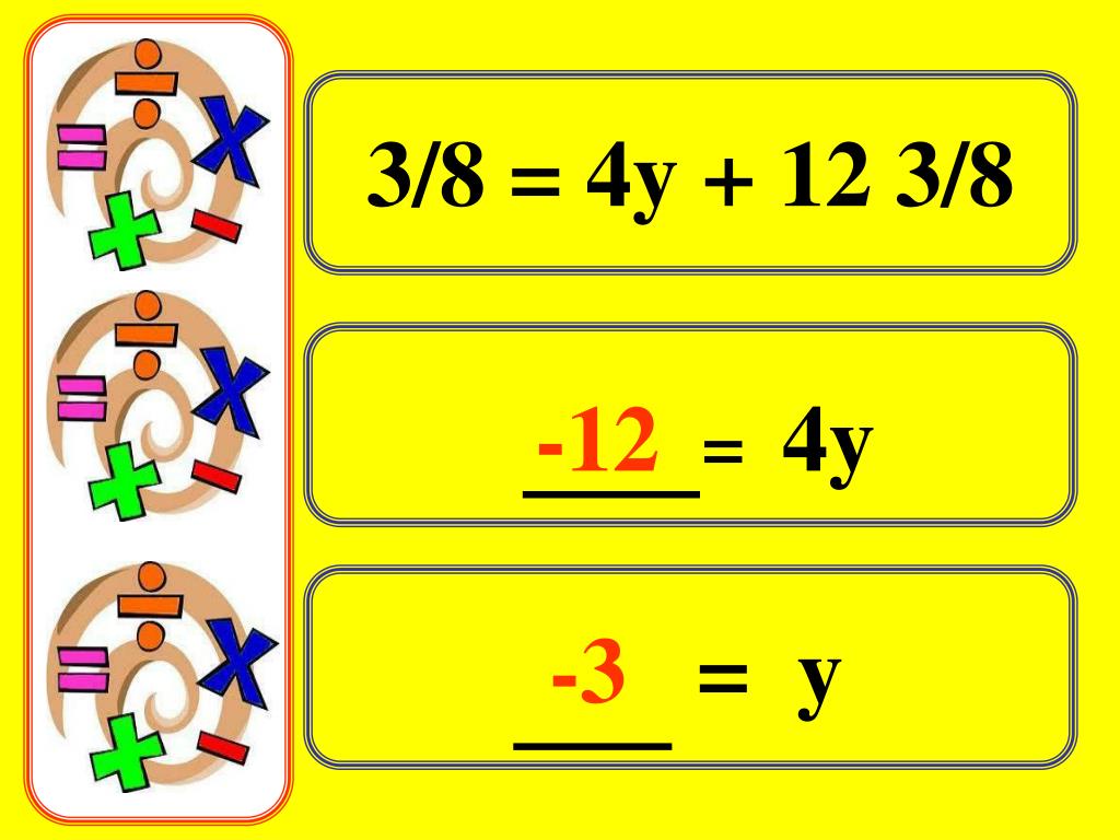 3/8 = 4y + 12 3/8 -12 = 4y -3 = y