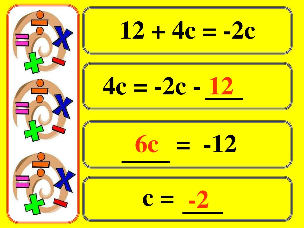 12 + 4c = -2c 4c = -2c - 12 6c = -12 c = -2