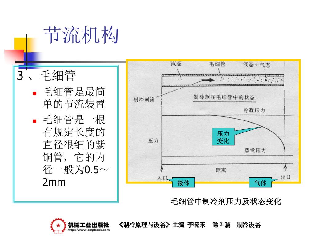 节流机构 3 、毛细管 • 毛细管是最简单的节流装置 • 毛细管是一根有规定长度的直径很细的紫铜管,它的内径一般为0.5~2mm 压力变化 液体 气体 毛细管中制冷剂压力及状态变化