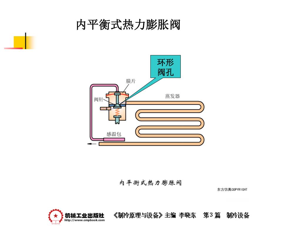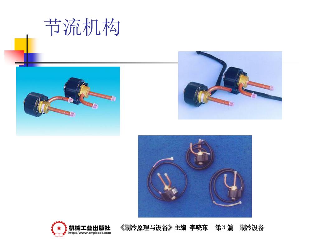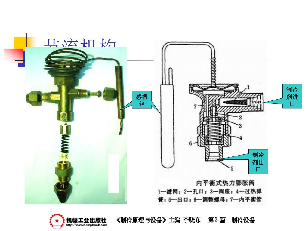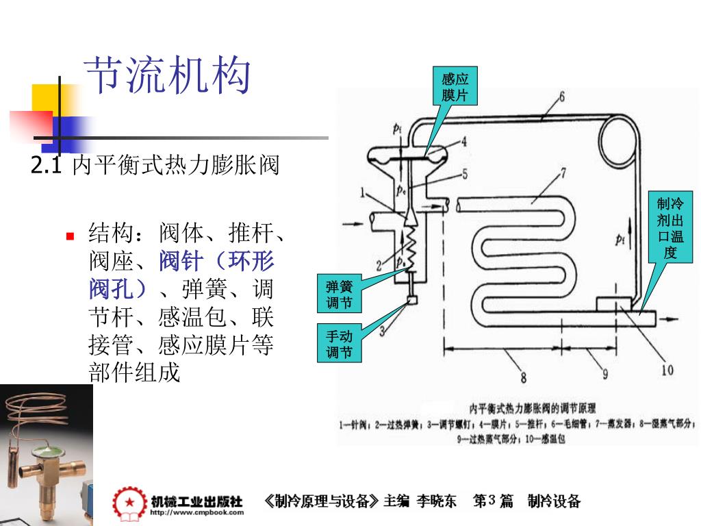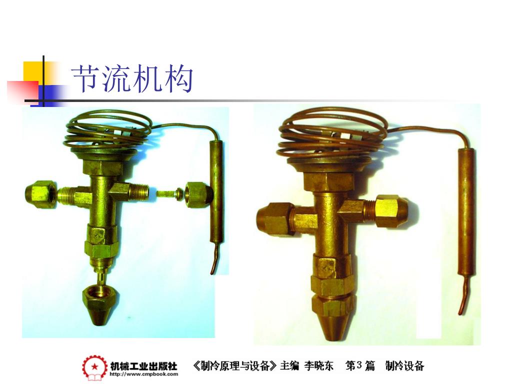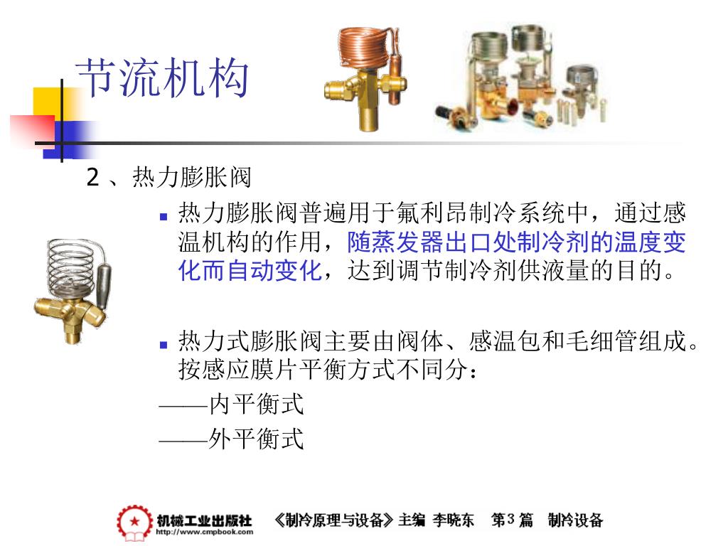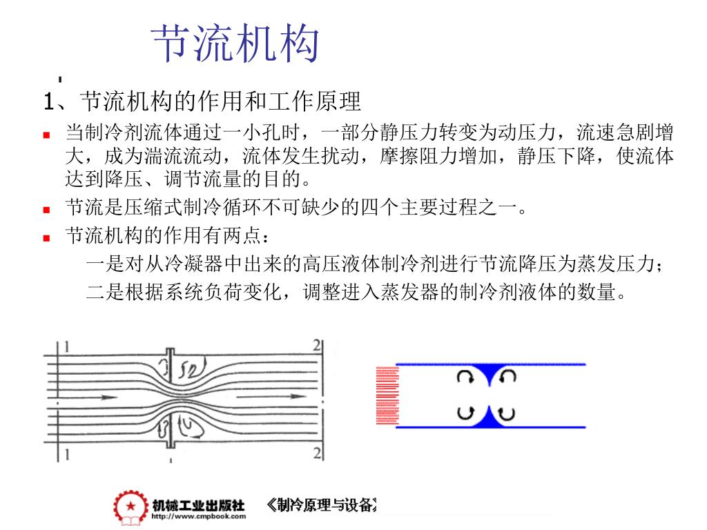 制冷原理与设备 —— 节流机构. 节流机构. 1 、节流机构的作用和工作原理 当制冷剂流体通过一小孔时,一部分静压力转变为动压力,流速急剧增大,成为湍流流动,流体发生扰动,摩擦阻力增加,静压下降,使流体达到降压、调节流量的目的。 节流是压缩式制冷循环不可缺少的四个主要过程之一。 节流机构的作用有两点: 一是对从冷凝器中出来的高压液体制冷剂进行节流降压为蒸发压力; 二是根据系统负荷变化,调整进入蒸发器的制冷剂液体的数量。. 节流机构. 2 、热力膨胀阀