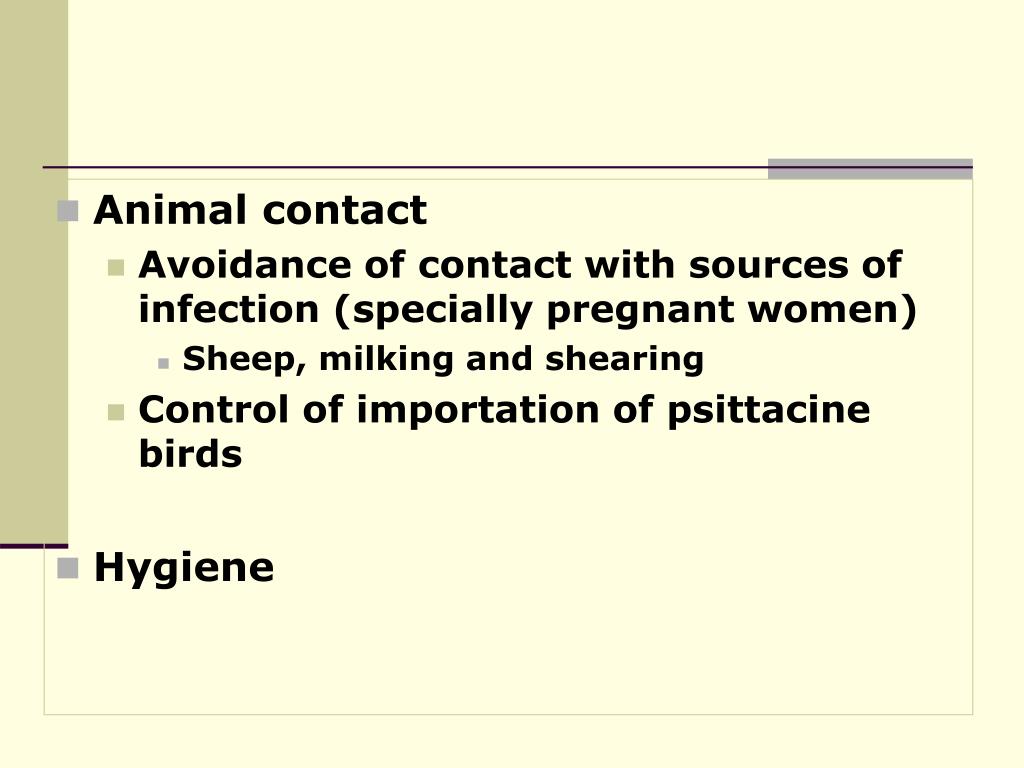 Animal contact • Avoidance of contact with sources of infection (specially pregnant women) • Sheep, milking and shearing • Control of importation of psittacine birds • Hygiene