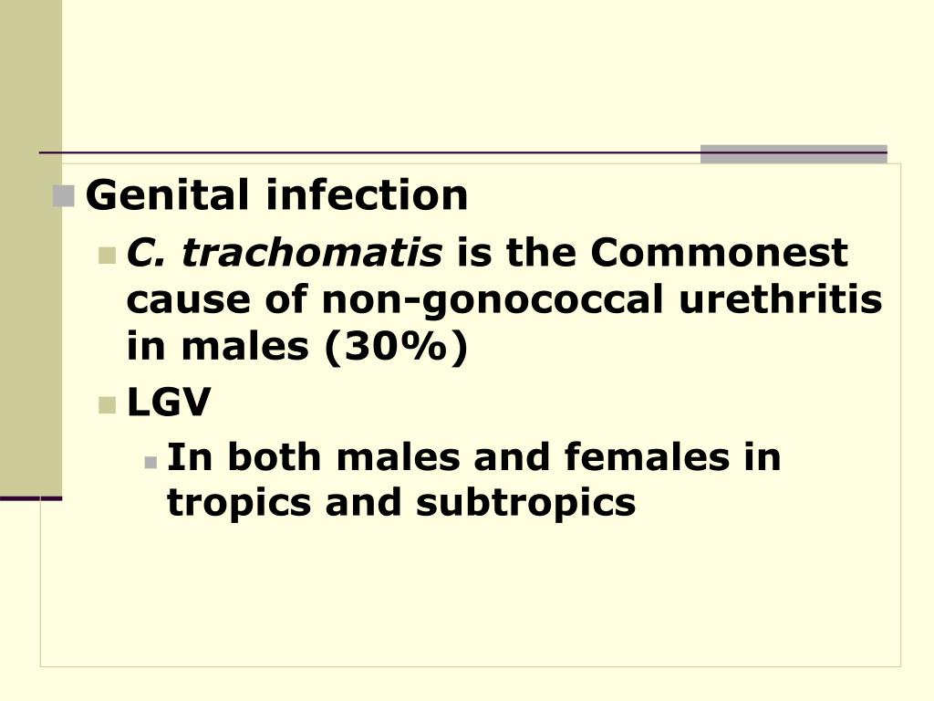 Genital infection • C. trachomatis is the Commonest cause of non-gonococcal urethritis in males (30%) • LGV • In both males and females in tropics and subtropics
